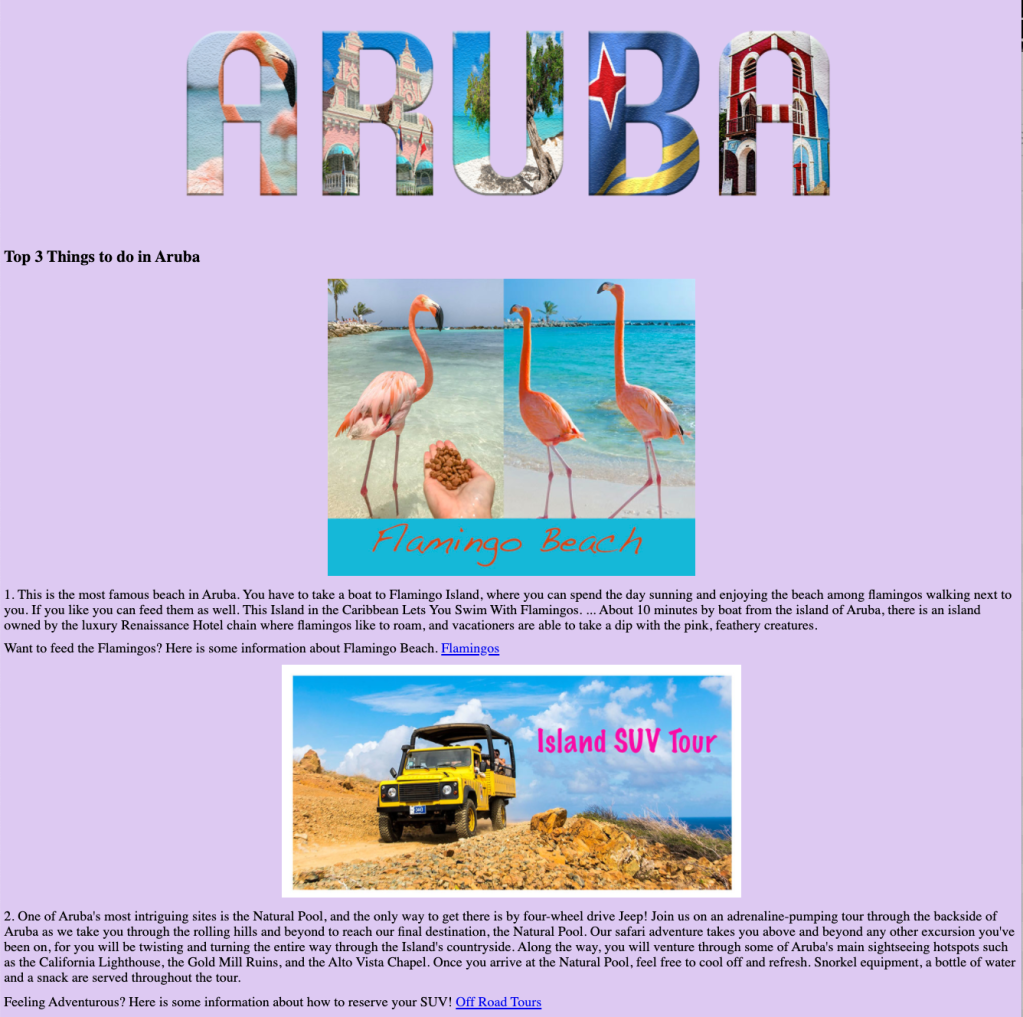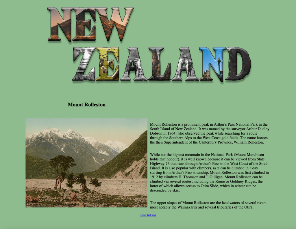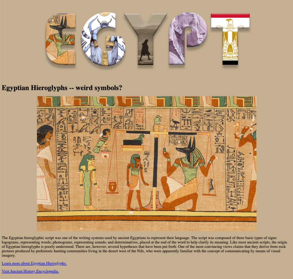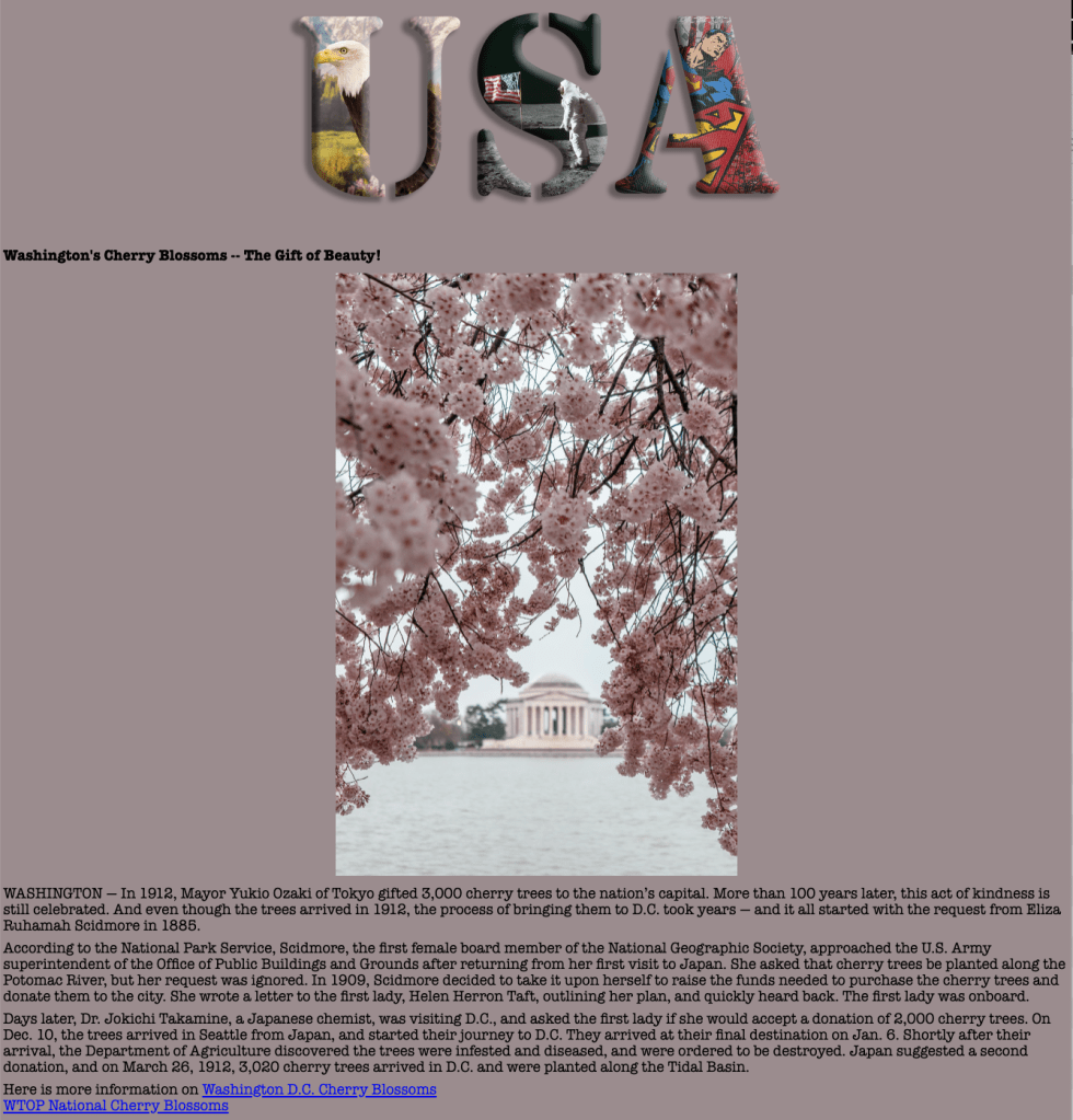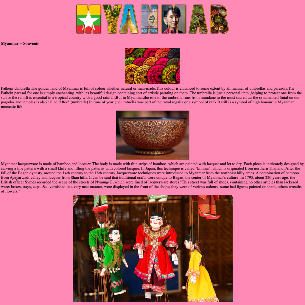 Mid-semester we take a brief journey into the world of HTML (hyper text mark-up language — the language of the Web). Students choose subject matter, again relating to their country-of-choice, and utilize Adobe Dreamweaver, an HTML editor, to create a two-page linked web site. They employ a variety of HTML5 elements and some principles of CSS (cascading style sheets) to combine text, a few supporting images, and the image of their text masking assignment.