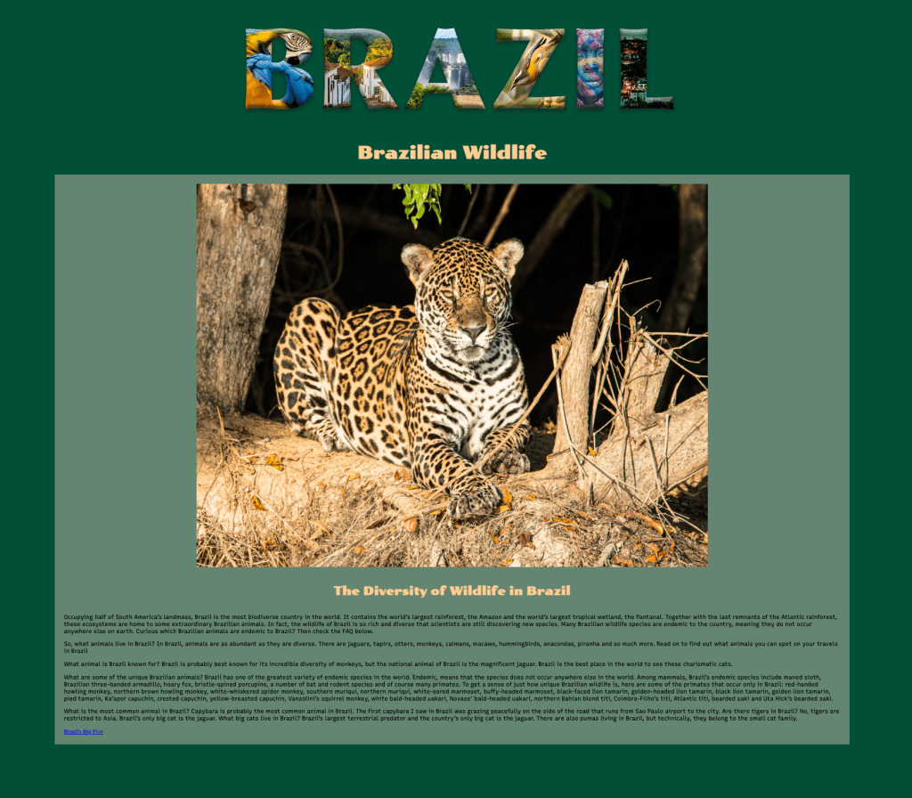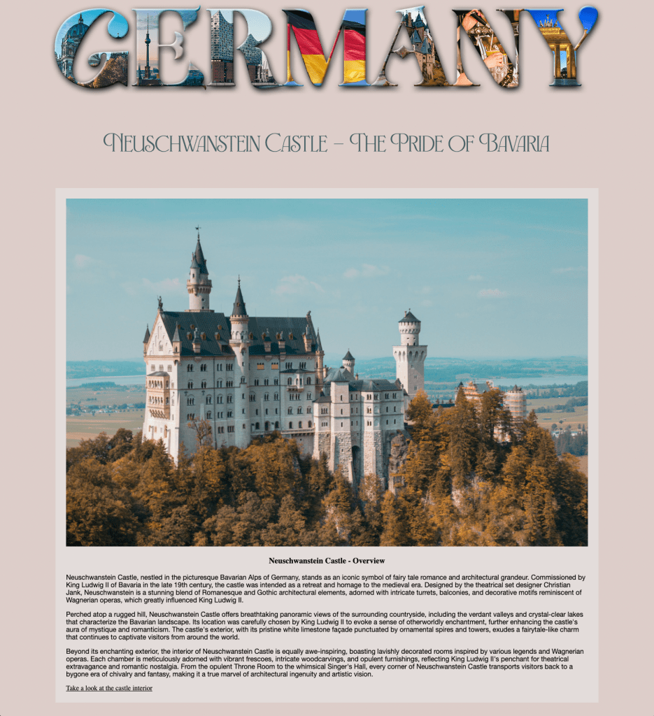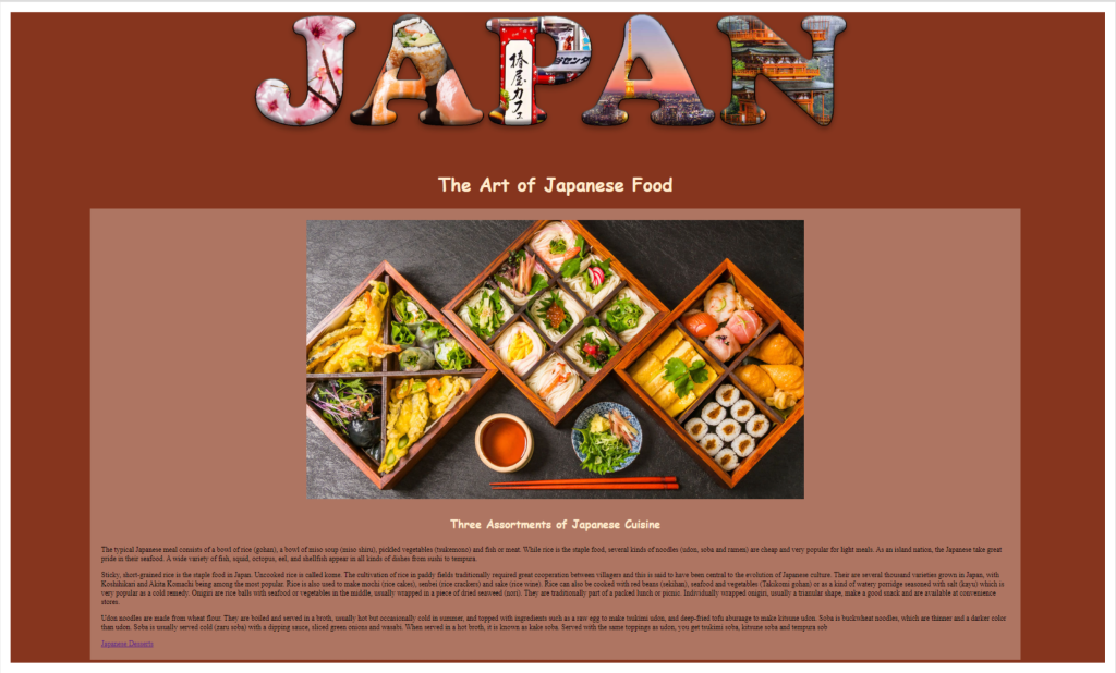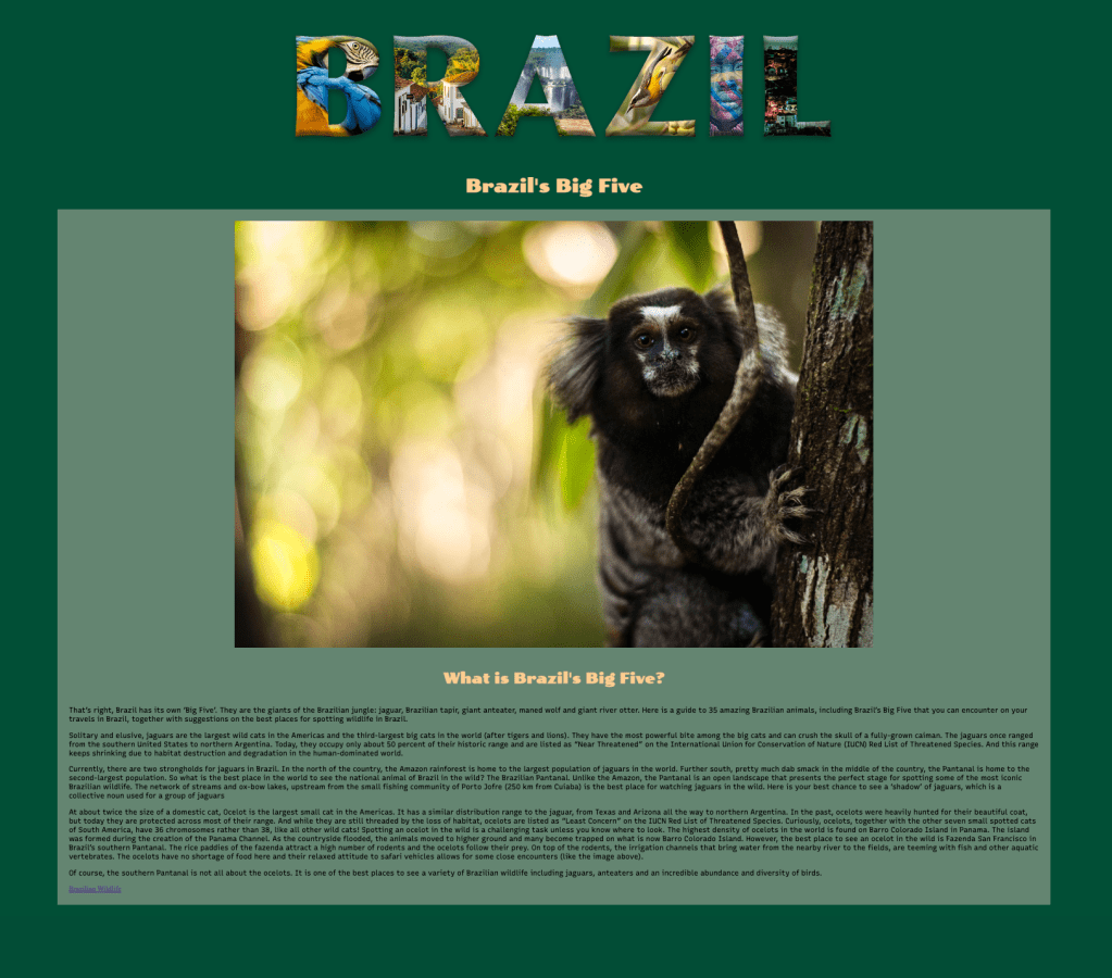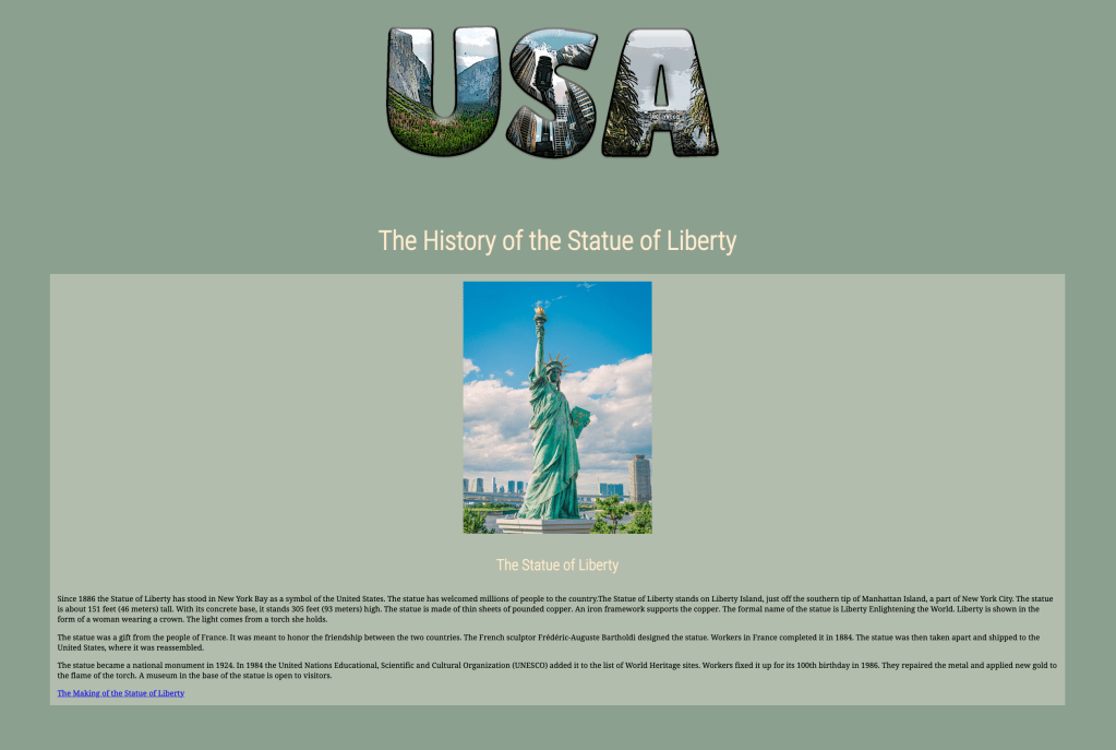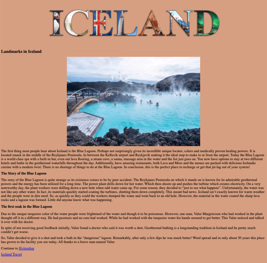 Mid-semester we take a brief journey into the world of HTML (hyper text mark-up language — the language of the Web). Students choose subject matter, again relating to their country-of-choice, and utilize Adobe Dreamweaver, an HTML editor, to create a two-page linked web site. They employ a variety of HTML5 elements and some principles of CSS (cascading style sheets) to combine text, a few supporting images, and the image of their text masking assignment.